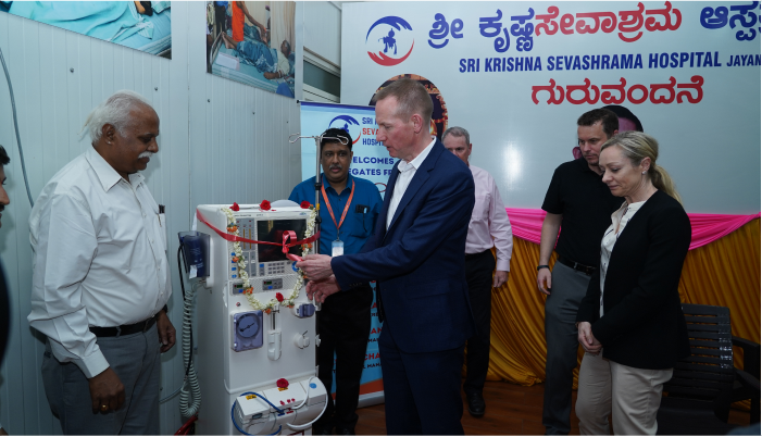 India の Bengaluru に位置する Sri Krishna Sevashrama 病院は、手頃な価格で利用しやすく、質の高い医療を提供しています。当初は無料診療所でしたが、経済的に困窮している患者様を診る人気の地域病院へと成長しました。Moogは、透析装置5台、レーザー装置1台、麻酔器1台など、医療機器の寄付を通じて、同病院を継続的に支援してきました。